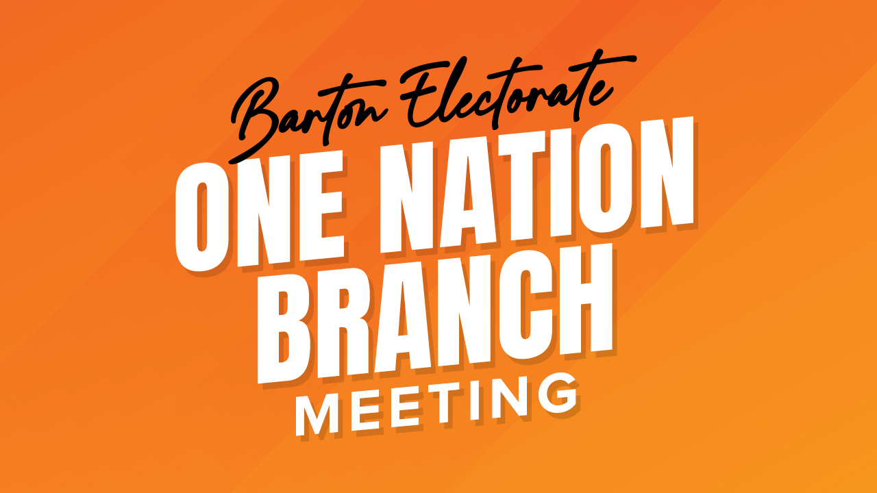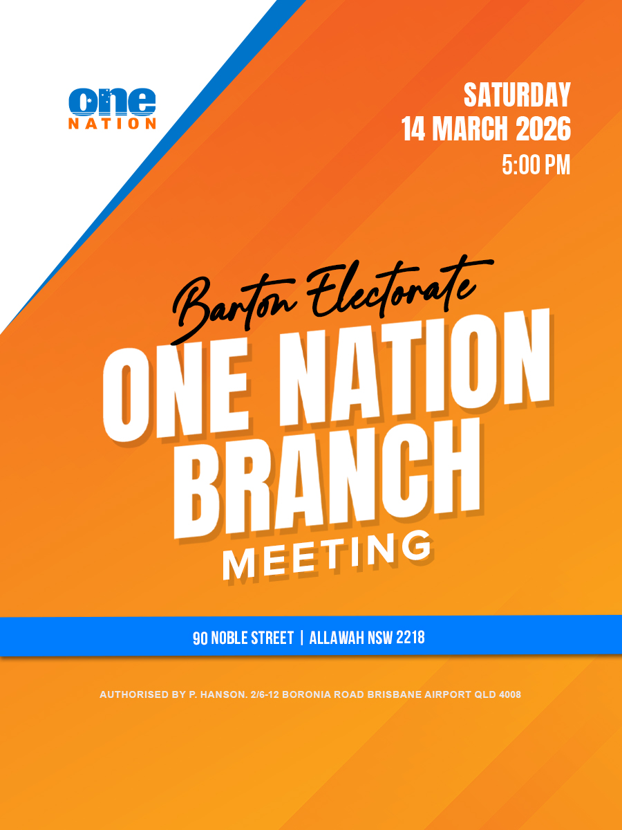 Join us for the Barton Electorate One Nation Branch Meeting on Saturday, 14 March 2026 at 5:00 PM at 90 Noble Street, Allawah NSW 2218.