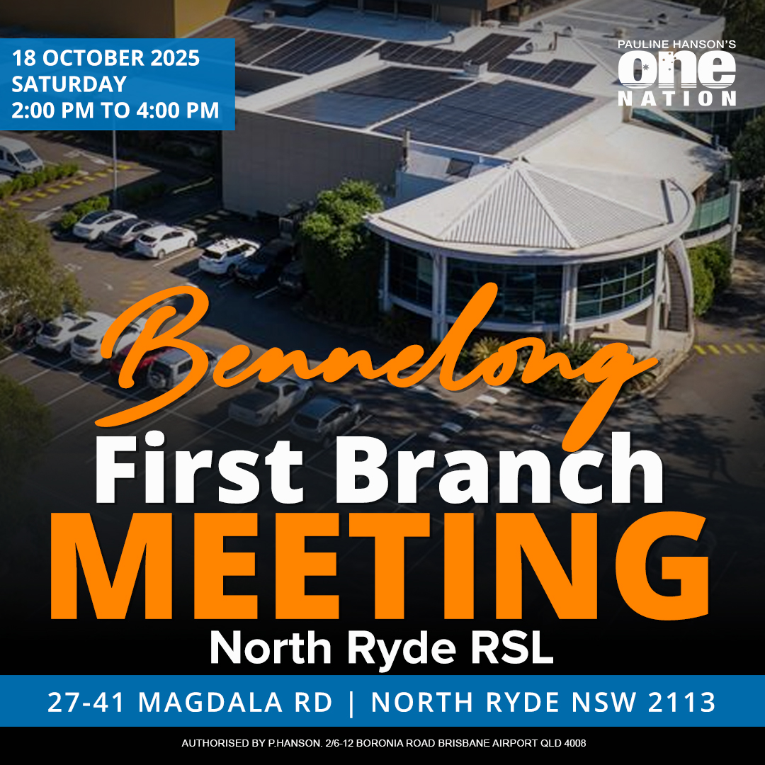 Join us for the First Meeting of the Bennelong Branch on Saturday, 18 October 2025, from 2:00 pm to 4:00 pm at North Ryde RSL, 27–41 Magdala Rd, North Ryde NSW 2113. This important first meeting is a chance to connect with like-minded locals, discuss the issues that matter most in Bennelong, and get involved in shaping the future of One Nation in the electorate. All are welcome – bring a friend and be part of building a strong community branch.