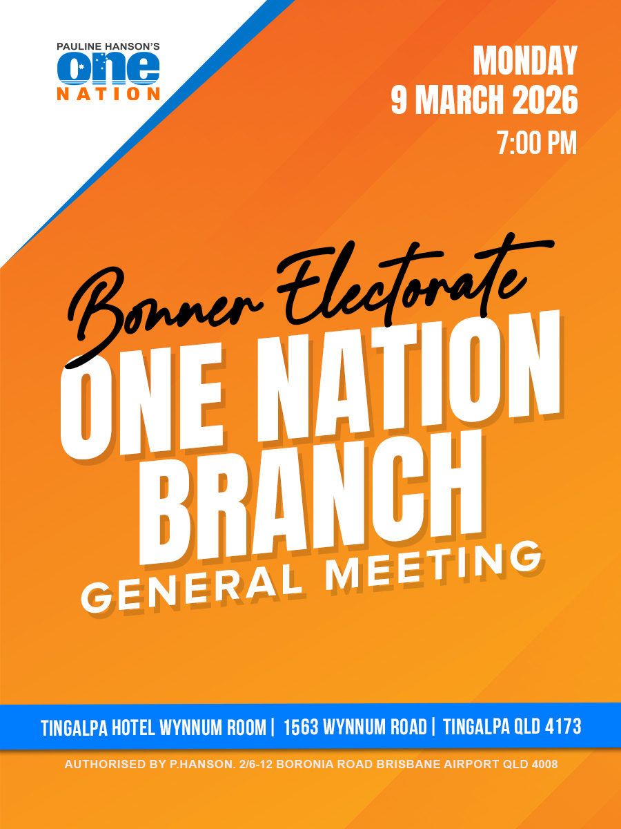Join us for the Bonner Electorate One Nation Branch General Meeting on Monday, 9 March 2026 at 7:00 PM at Tingalpa Hotel Wynnum Room, 1563 Wynnum Road, Tingalpa QLD 4173.