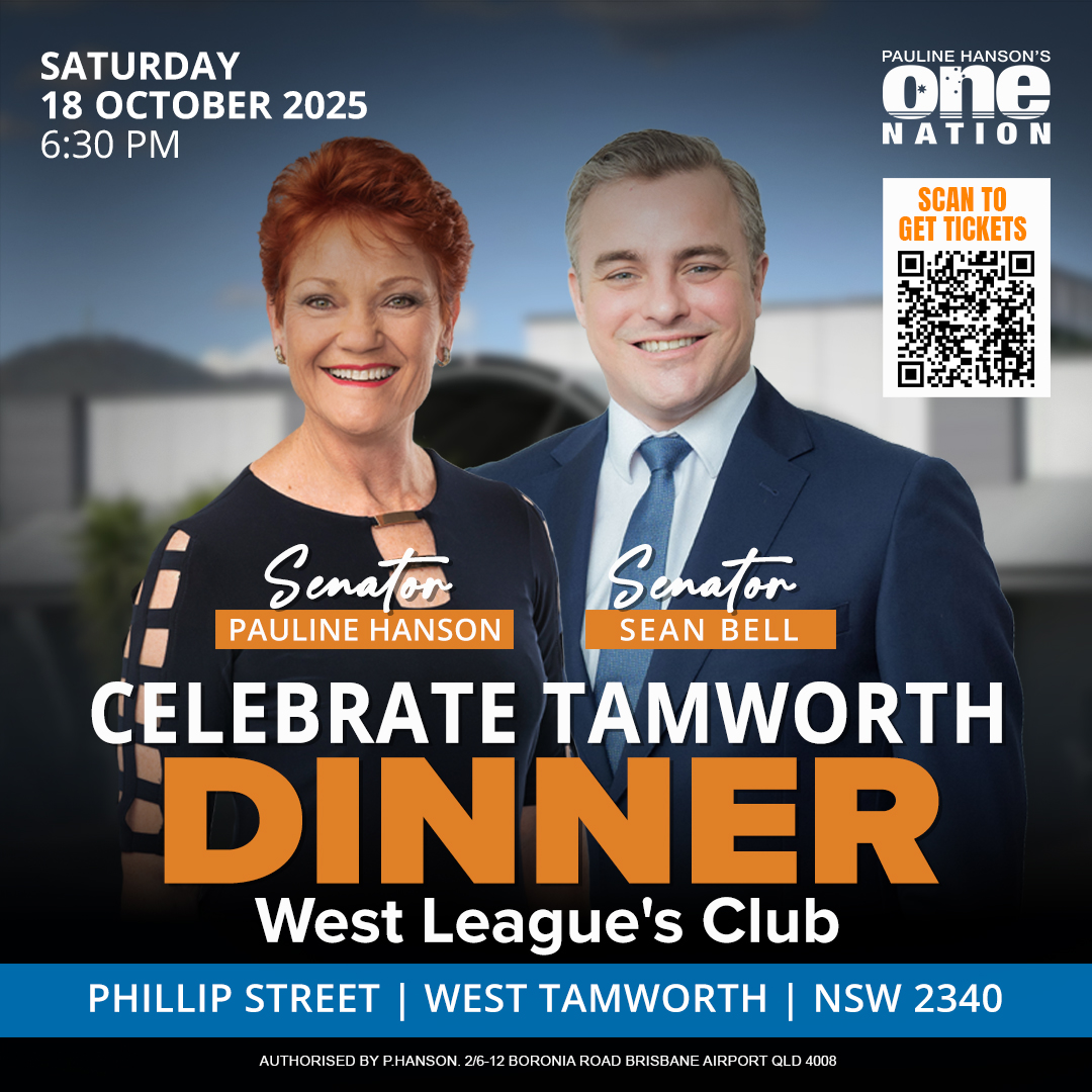 Stay on after the branch launch and join us for the Celebrate Tamworth Dinner on Saturday, 18 October 2025, at 6:30 pm, at Wests League’s Club, Phillip Street, West Tamworth, NSW 2340. Featuring Senator Pauline Hanson and Senator Sean Bell, this dinner will be a wonderful evening of community spirit, lively conversation, and the chance to share a meal with fellow supporters.