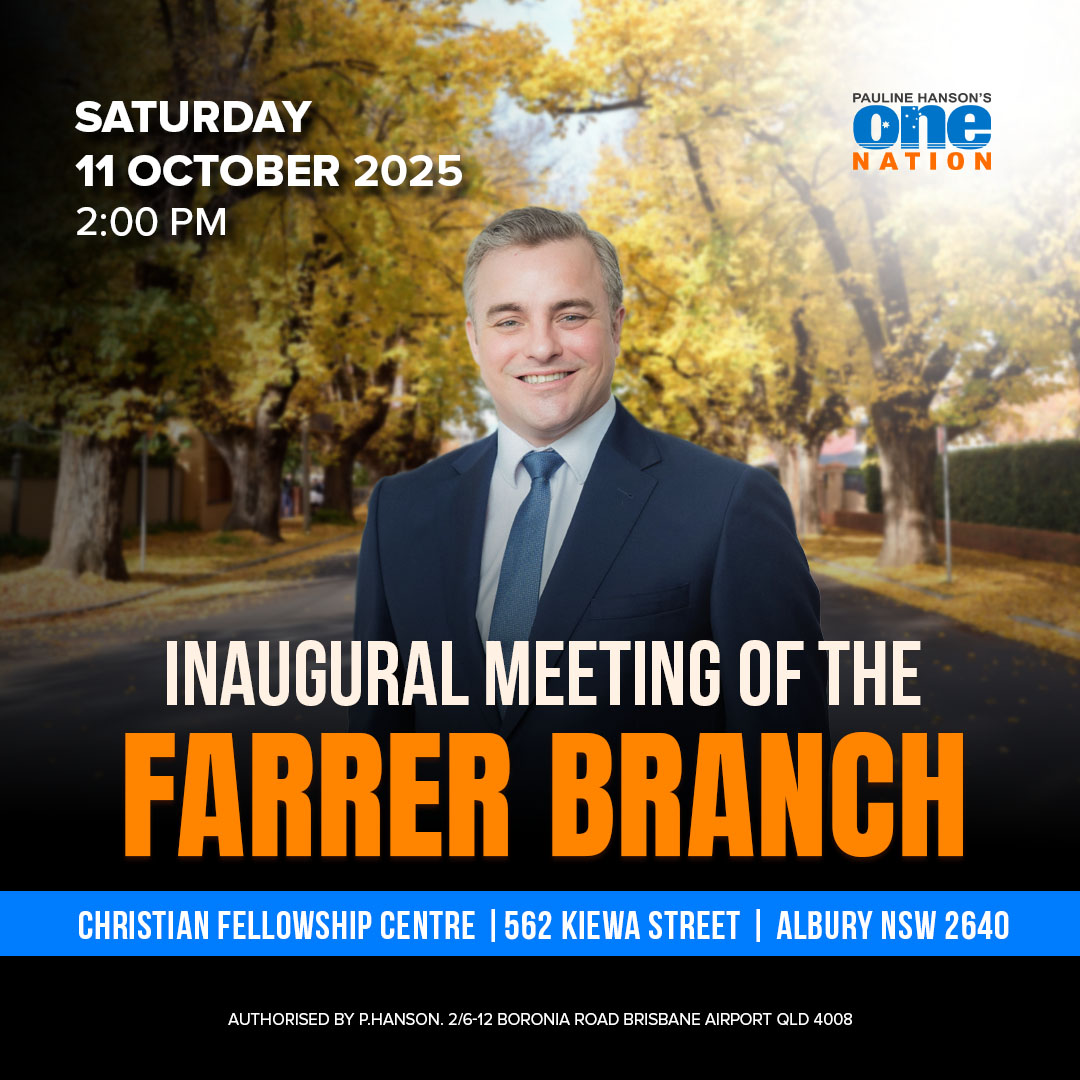 This exciting event will feature Senator Sean Bell, who will be attending to meet with local supporters and discuss One Nation’s vision for the Farrer electorate. The meeting will be hosted by Emma Hicks and marks an important milestone in the establishment of a new and active One Nation branch in the region. Don’t miss this opportunity to connect, contribute, and help shape the future of the Farrer Branch.