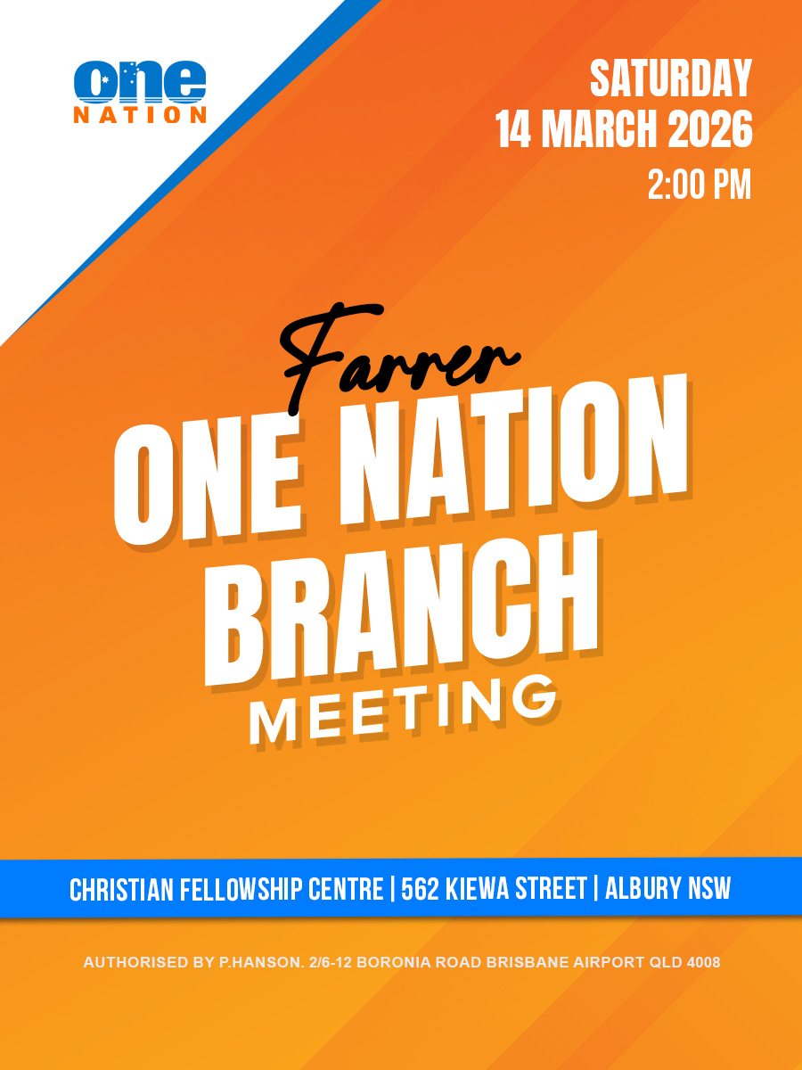 Join us for the Farrer One Nation Branch Meeting on Saturday, 14 March 2026 at 2:00 PM. This meeting provides an opportunity for members and supporters to hear updates, discuss local issues, and stay engaged within the electorate.