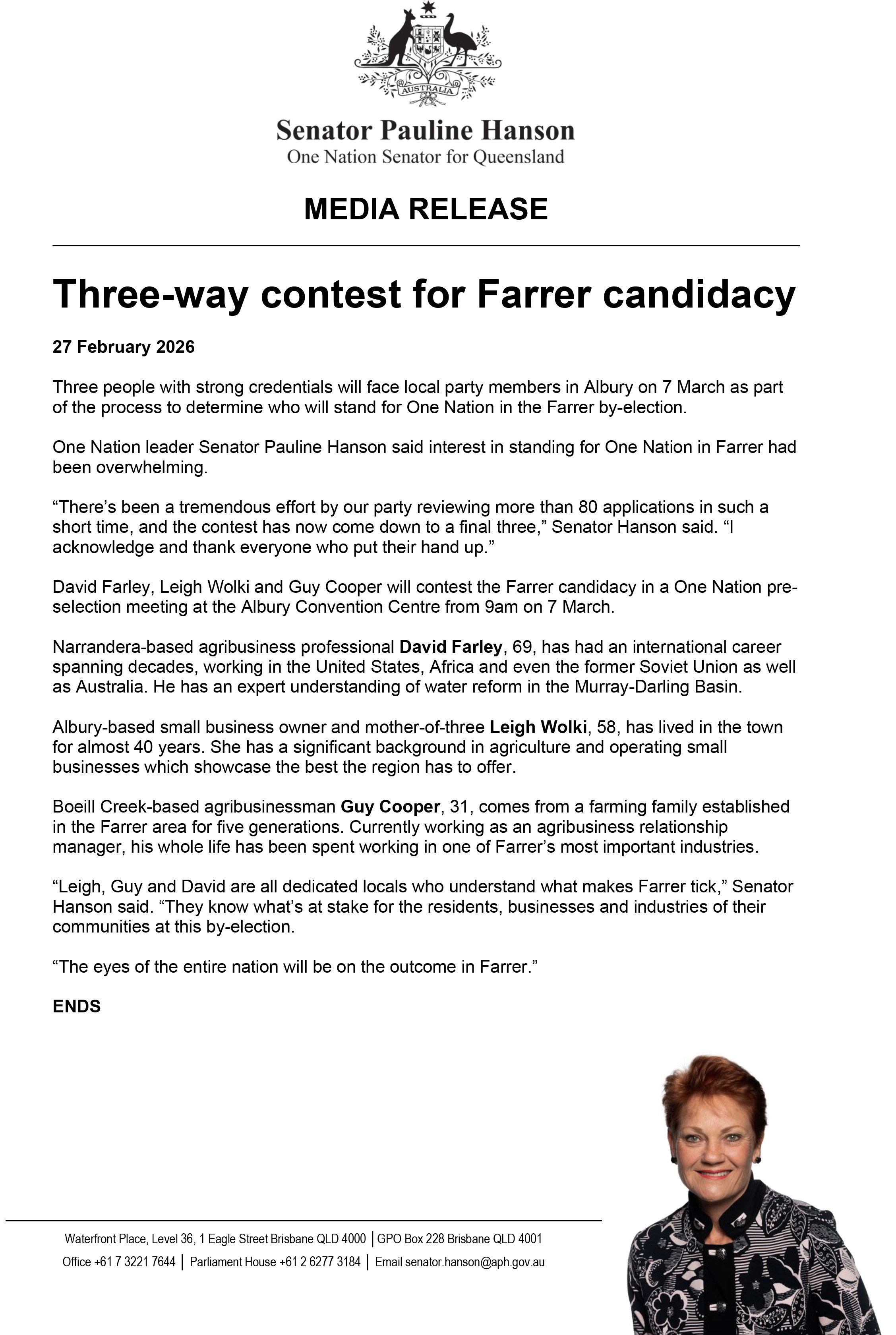 “Leigh, Guy and David are all dedicated locals who understand what makes Farrer tick,” Senator Hanson said. “They know what’s at stake for the residents, businesses and industries of their communities at this by-election.