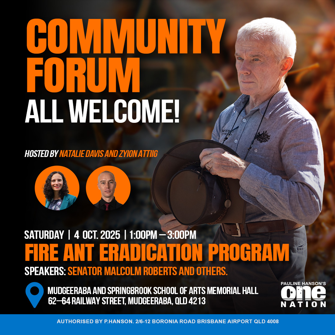 Join us for a Community Forum on the Fire Ant Eradication Program at the Mudgeeraba and Springbrook School of Arts Memorial Hall on Saturday, 4 October 2025, from 1:00 PM to 3:00 PM. Hosted by Natalie Davis and Zyion Attiig, the event will feature Senator Malcolm Roberts and other guest speakers discussing the impact of fire ants and the strategies being implemented to address the issue. This is a valuable opportunity for locals to learn more, ask questions, and have their voices heard in shaping the community’s response.