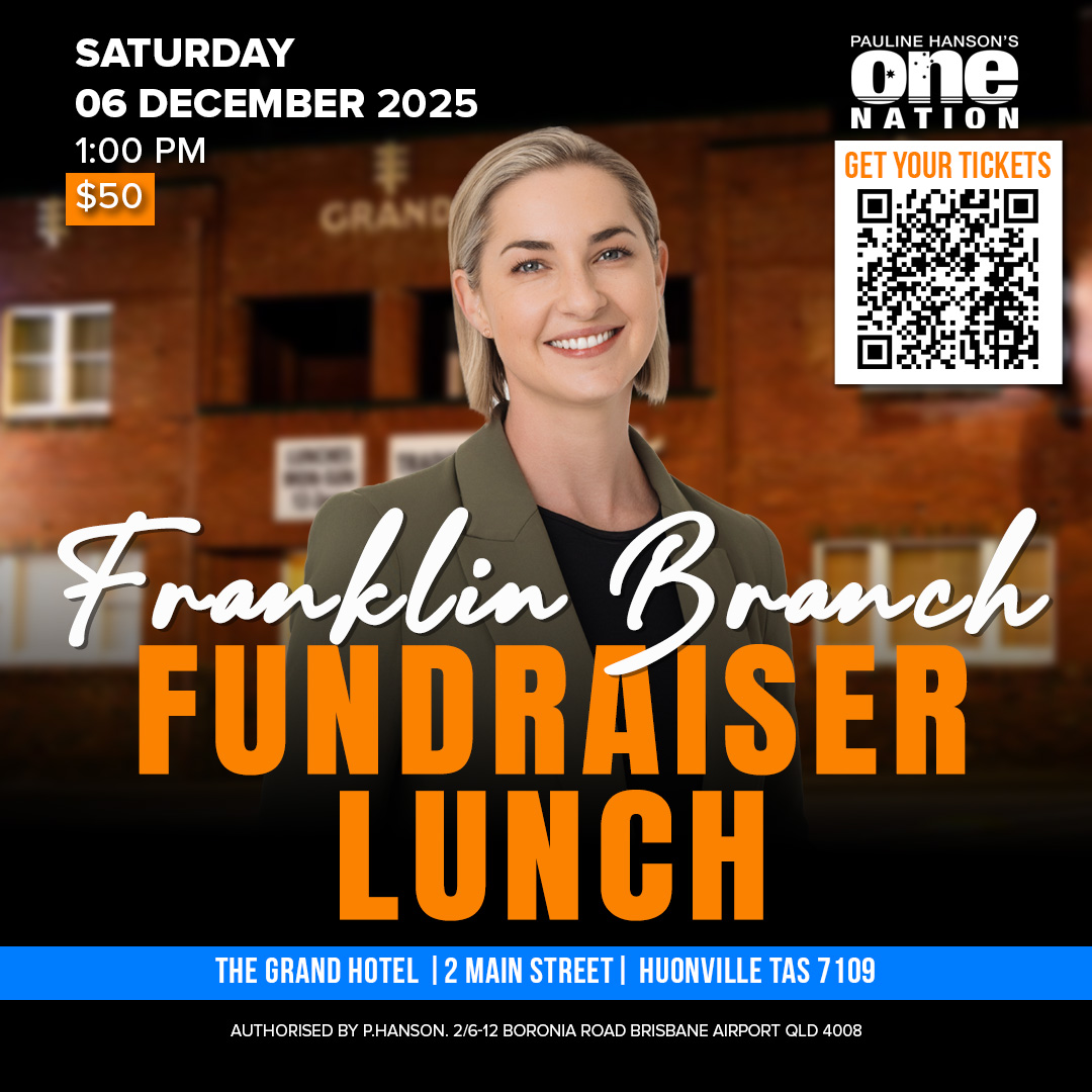 Join Pauline Hanson’s One Nation for the Franklin Branch Launch Fundraiser Lunch! Hear from Lee Hanson, enjoy a delicious two-course meal, and connect with fellow supporters.