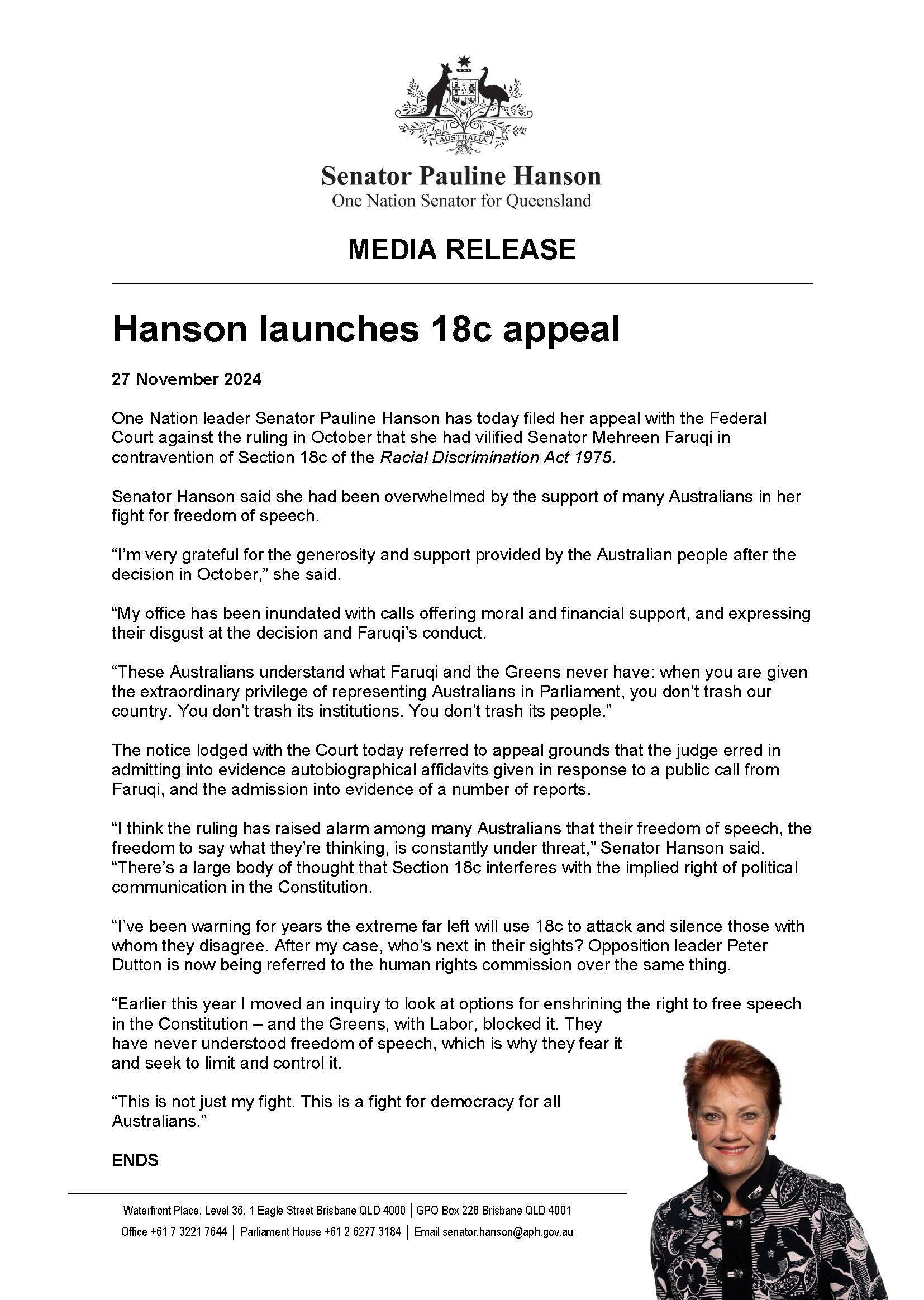 One Nation leader Senator Pauline Hanson has today filed her appeal with the Federal Court against the ruling in October that she had vilified Senator Mehreen Faruqi in contravention of Section 18c of the Racial Discrimination Act 1975.