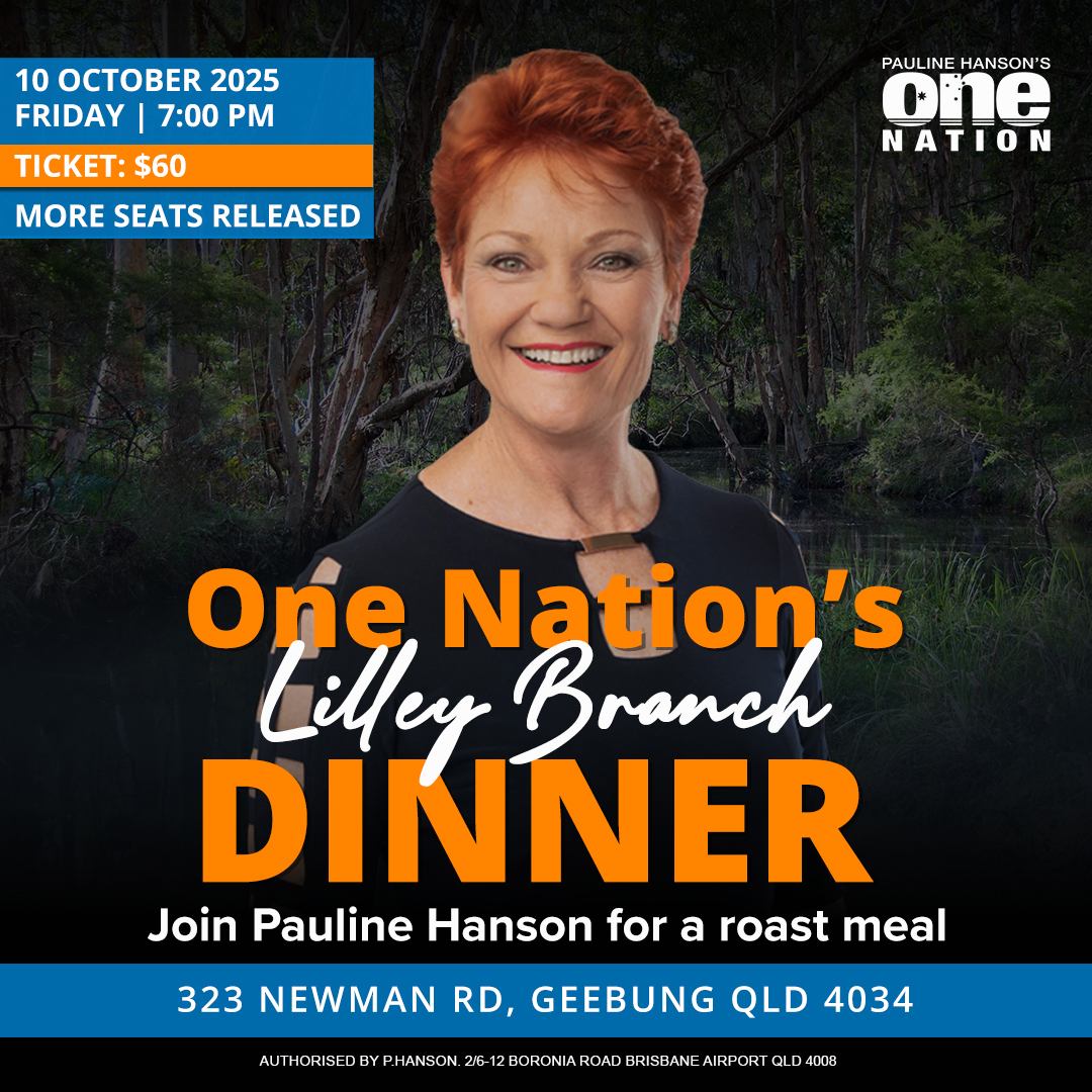 Join Senator Pauline Hanson for an evening of connection, community, and conversation at the One Nation Lilley Branch Dinner. Enjoy a hearty roast meal at Geebung RSL with your choice of slowly roasted beef with mustard or roast pork with apple sauce.