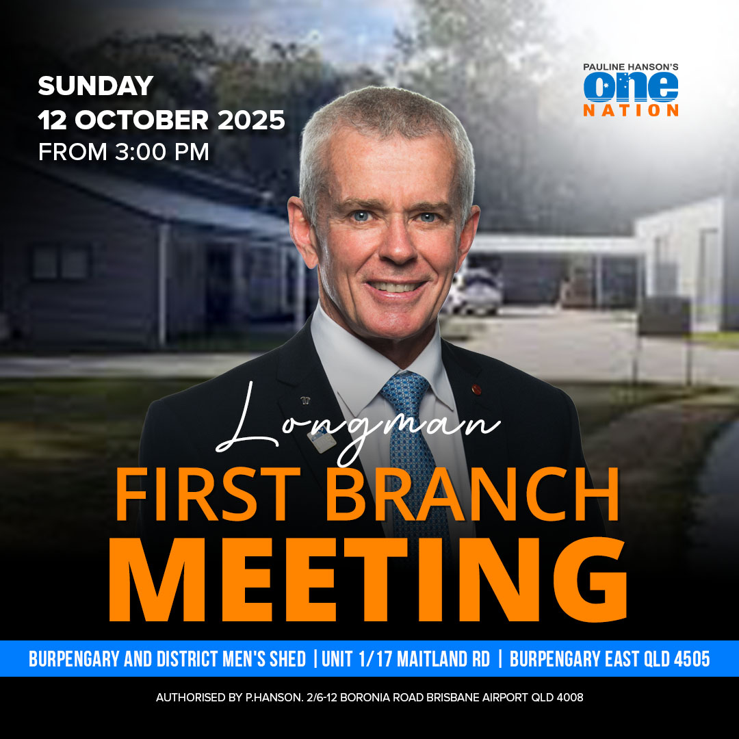 Join us for the First Meeting of the Longman Branch on Sunday, 12 October 2025 from 3:00 pm at the Burpengary and District Men’s Shed, Unit 1/17 Maitland Rd, Burpengary East QLD 4505. Special guest Senator Malcolm Roberts will be in attendance, making this a great opportunity to connect directly with your representative. This first meeting will bring the community together to discuss the issues that matter most in Longman and to establish a strong and active branch.