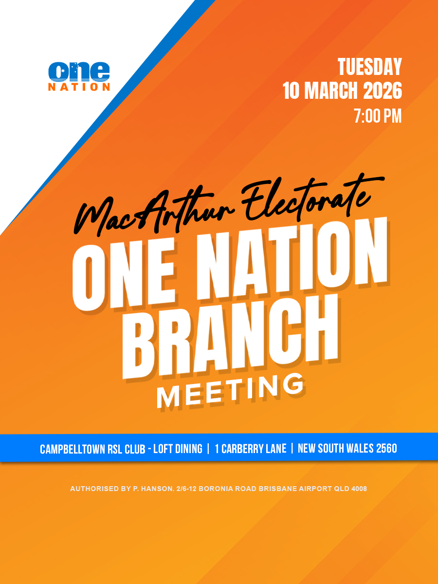 Join us for the MacArthur Electorate One Nation Branch Meeting on Tuesday, 10 March 2026 at 7:00 PM. This meeting provides an opportunity for members and supporters to come together, discuss local priorities, and stay engaged with activities in the electorate.