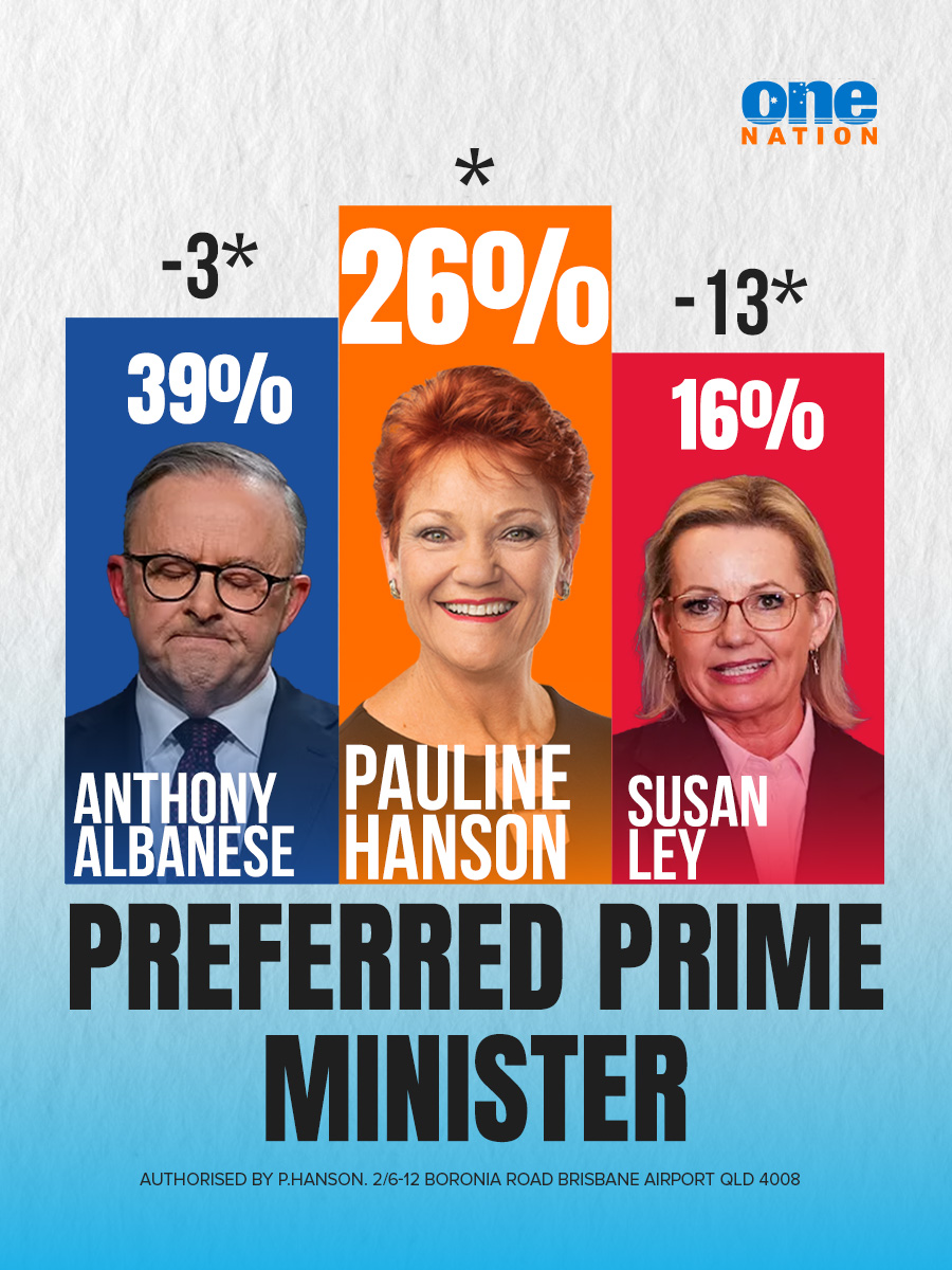 For the first time ever, Pauline Hanson has been included in the preferred Prime Minister ratings, and it’s a strong debut. Australians want one nation, united. They are tired of Labor’s division and grievance politics. Pauline Hanson has a plan to lower power prices, reduce taxes, and slash government waste.