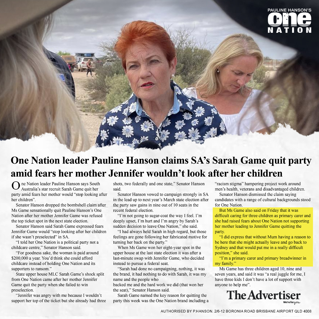 But Ms Game also said on Friday that it was difficult caring for three children as primary carer and she had raised fears about One Nation not supporting her mother leading to Jennifer Game quitting the party.