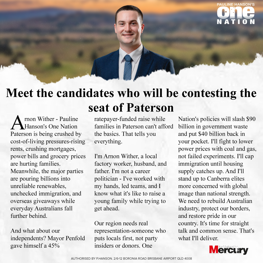 Paterson is being crushed by cost-of-living pressures-rising rents, crushing mortgages, power bills and grocery prices are hurting families. Meanwhile, the major parties are pouring billions into unreliable renewables, unchecked immigration, and overseas giveaways while everyday Australians fall further behind.