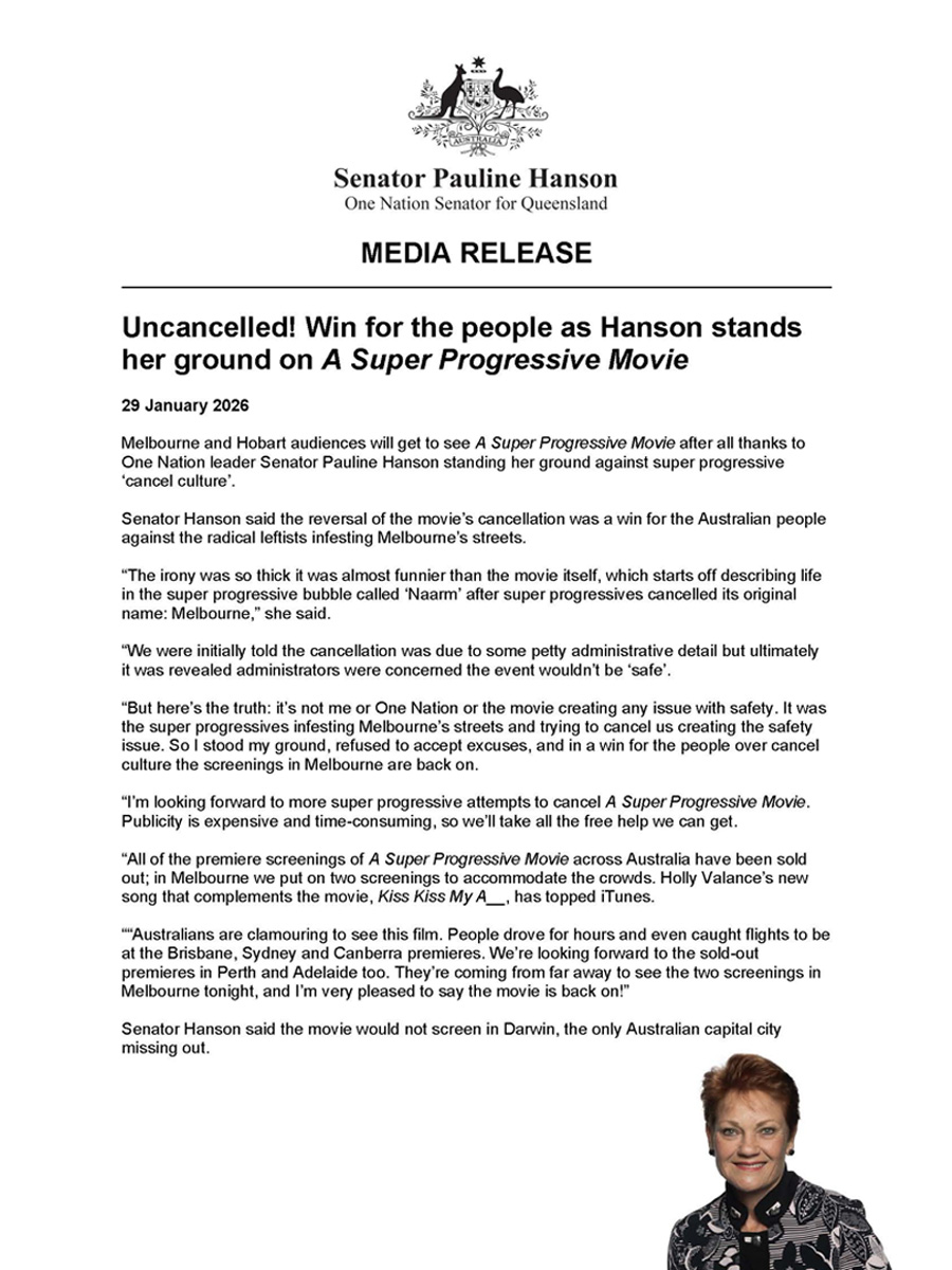 Melbourne and Hobart audiences will get to see A Super Progressive Movie after all thanks to One Nation leader Senator Pauline Hanson standing her ground against super progressive